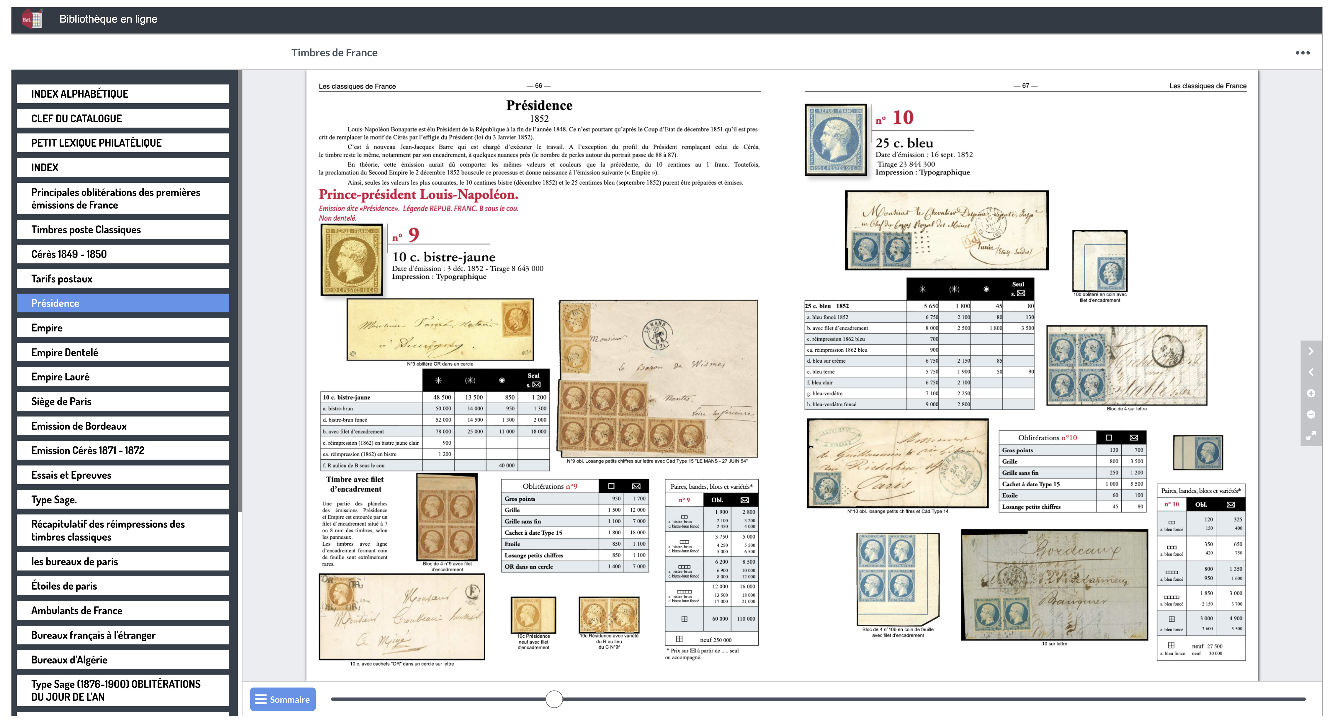 Cette formule d'abonnement (par an) permet la consultation des spécialisés Yvert et Tellier : CLASSIQUES DU MONDE : 1840-1940 et SEMI-MODERNES DU MONDE : 1941-1960 (Vol. 1 & 2) et Le Tome de référence des catalogues 2019 : Guide d'utilisation des catalogues d'identification des timbres Avec le catalogue "CLASSIQUES DU MONDE : 1840/1940", vous pénétrez au coeur de l'univers merveilleux de la philatélie. Découvrez les plus somptueux et les plus emblématiques timbres de la période classique et partez à la découverte de l'histoire postale ! Le catalogue spécialisé « Les Classiques du monde » 1840-1940 est la source principale d'informations concernant le premier siècle de la philatélie. Il vous fait découvrir en grand angle, les premières émissions de tous les pays du monde, classés par ordre alphabétique. Les particularité du CLASSIQUES DU MONDE : 1840/1940 : - Des centaines de nouvelles variétés dans plusieurs pays - Apparition de cotations sur 3 colonnes pour de nombreux pays, notamment l'Allemagne et une partie des anciennes colonies françaises. - Création d'une rubrique dédiée aux Treaty Ports en Chine - Création d'une rubrique sur les timbres fiscaux-postaux et timbres préoblitérés aux États-Unis - Création d'une rubrique dédiée aux carnets de Grande-Bretagne - Redécoupage des zones occupées en Italie pendant la Première Guerre mondiale - Ajout de nombreux visuels dans l'ensemble du catalogue, notamment pour les timbres des maîtres de postes aux États-Unis ou encore dans les bureaux étrangers du Levant. Pour complétez le catalogue des Classiques du Monde de 1840 à 1940, les Semi-Modernes (Vol.1 et 2) reprenent tous les timbres du monde de 1941 à 1960 de Aden à Luxembourg (Vol. 1) et de Macao à Zanzibar (Vol. 2). Les principales fonctionnalités 1. Chargement ultra-rapide : Les pages sont pré-chargées au fur et à mesure de votre utilisation pour vous assurer une navigation fluide et aisée. 2. Sommaire. Un sommaire offre désormais la possibilité de consulter les timbres classés par pays. 3. Feuilletage à la volée : Lisez et tournez les pages des catalogues comme s'il s'agissait d'un véritable livre en papier. Parce que le support papier est encore cher à chacun de nous, nous avons décidé de garder ce lien à la tradition. Sur tablette, la facilité du tactile offre une lecture plus agréable et ergonomique. Une rotation automatique de l'écran s'effectue en fonction de votre mode de lecture. 4. Zoom : D'un simple clic, vous pouvez à tout moment agrandir n'importe quelle zone. Vous vous déplacez dans la page d'un simple mouvement de souris. Un zoom intuitif, fluide et performant à la fois. Paramétrez vous-même l'ampleur du zoom. 5. Navigation intelligente : Désormais, le moteur de recherche établit un historique de navigation et mémorise vos consultations pour faciliter vos recherches. 6. Personnalisez vos catalogues : Grâce à la nouvelle version, vous avez la possibilité d'ajouter des notes, écrites ou orales, au cours de votre lecture. Une fois sauvegardée, retrouvez votre note dans l'onglet « Mes notes », en haut à droite de l'écran. 7. Ultra-compatibilité : Parce que chaque personne possède un outil informatique unique, nous avons cherché le moyen d'être le plus compatible possible. La Bibliothèque en ligne est donc 100% compatible avec tous les navigateurs internet, sur Windows, sur Mac et Linux Comment consulter mon abonnement numérique : Pour accéder à votre abonnement, un délai d'une demi-journée (hors week-end) est nécessaire pour sa mise à disposition. Vous pouvez y accéder en suivant le lien suivant : ACCÉDER À MON ABONNEMENT. Une nouvelle fenêtre s'ouvrira, où il vous suffira d'entrer vos identifiants et mot de passe utilisés pour vous connecter à YVERT.COM. Veuillez noter que les accès situés en haut du site et dans votre espace personnalisé ne sont pas fonctionnels. Comment renouveler un abonnement ? Pour renouveler un abonnement, vous devez attendre la date anniversaire de celui-ci. La date d'échéance figure sur chacun des catalogues de votre abonnement. Le renouvellement se fait depuis le site YVERT.COM. Il vous suffit de mettre dans votre panier la formule choisie puis de valider votre commande. Configuration requise : Configuration Navigateur pour utilisation du lecteur en ligne : Chrome 50+, Firefox 45+ ou Safari 9+ ou IE 10+ ou Edge 14 Configuration pour utilisation du lecteur sur tablette : - IOS: Safari avec IOS9+ - Android : Android 53, Chrome 54 +, Firefox 50 +
