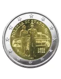 2 € commémorative - ITALIE : Merci aux professionnels de santé Pièces conditionnées dans des étuis de protections HARTBERGER® L'intérieur de la pièce représente un homme et une femme masqués, professionnels du domaine médical. L'un, médecin, possède un stéthoscope et un dossier médical. L'autre, tend à représenter une infirmière. Chacun d'eux travaillant de front pour la lutte contre le COVID-19. Sur le pourtour haut de la pièce, on distingue l'inscription "Grazie" suivie à droite d'un coeur et à gauche d'une croix, symbole du secteur pharmaceutique. Au centre, est présent le monogramme "RI" de la République Italienne et à droite la marque de la Monnaie de Rome "R" accompagnée en bas de l'année d'émission "2021". L'anneau externe de la pièce représente les douze étoiles du drapeau européen.